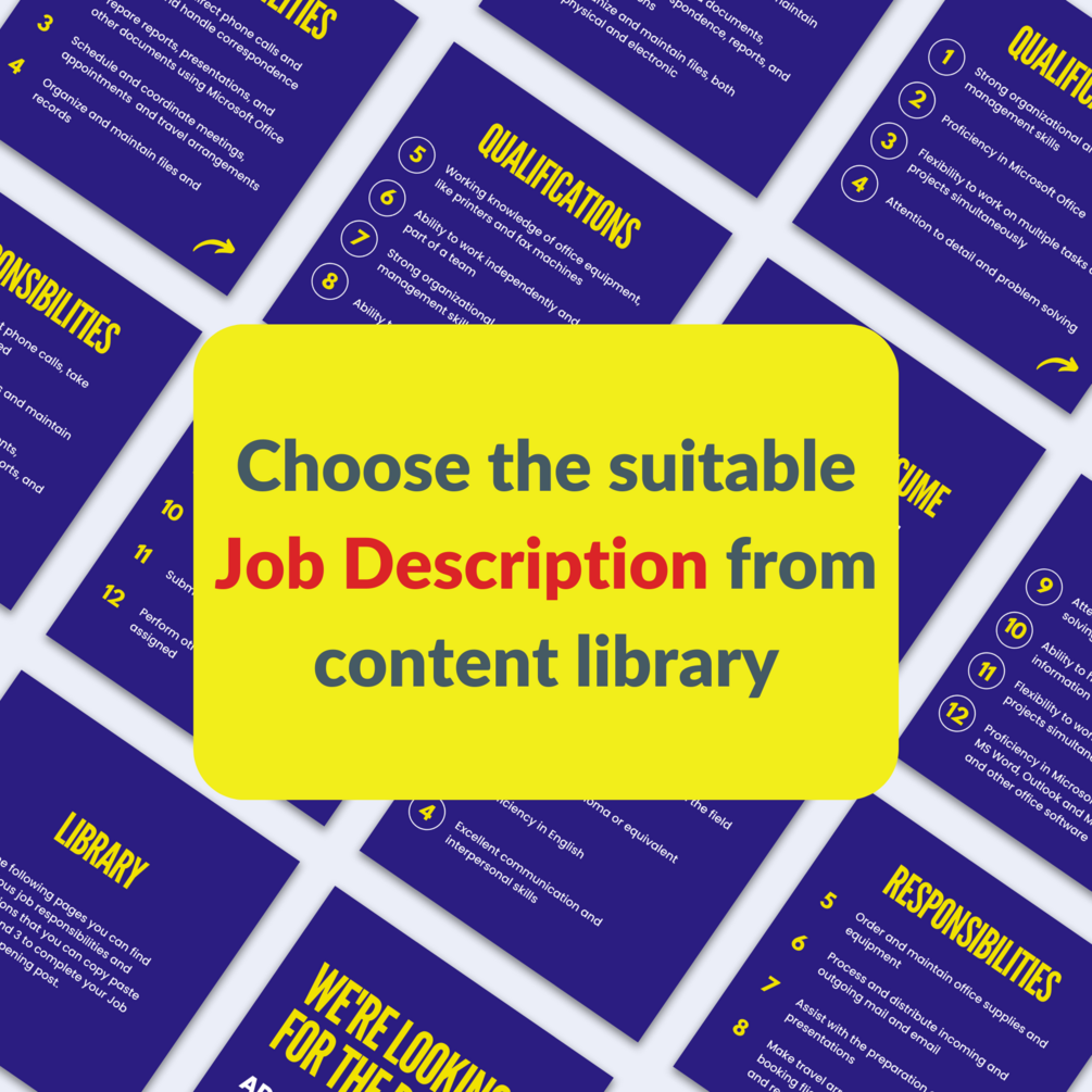- A selection of pre-written Admin Assistant job descriptions that businesses can choose from, ensuring that their listing accurately reflects the skills and requirements they are looking for.