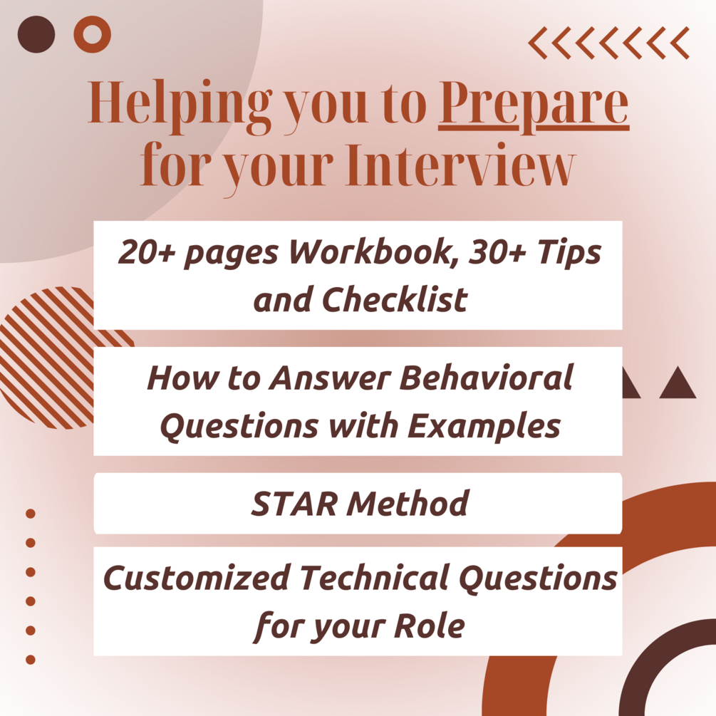 With over than 30 tips, step-by-step process, cheatsheet and checklist, you'll be fully prepared and confident for your upcoming interview.