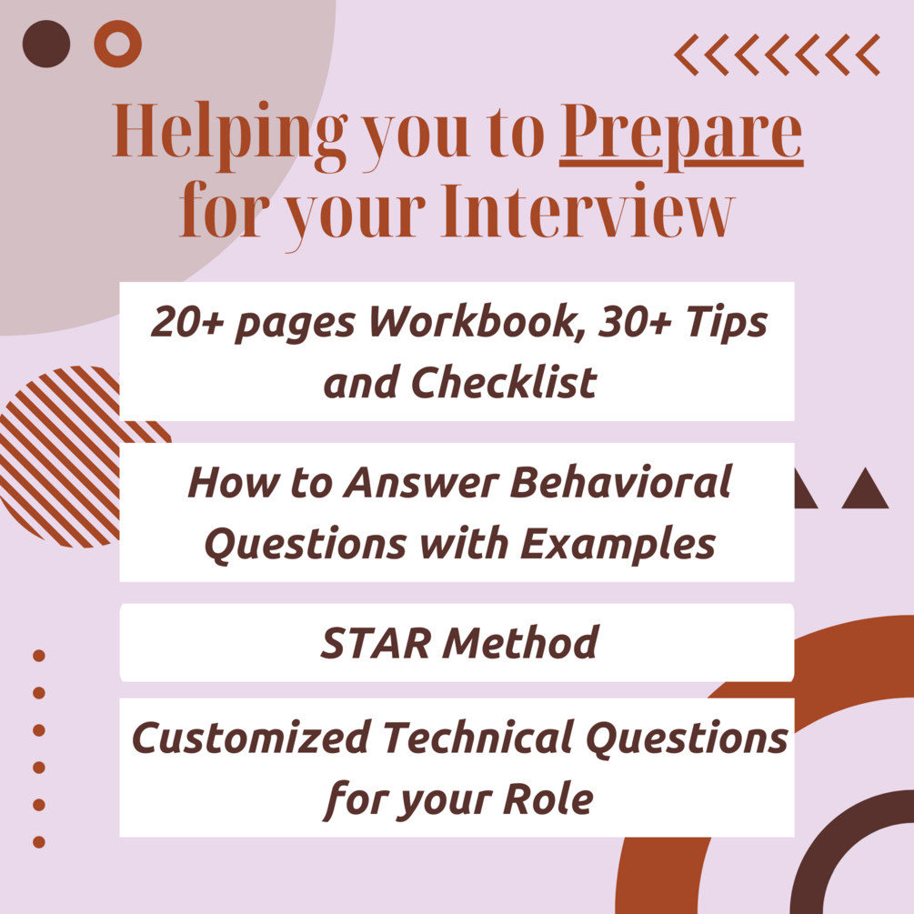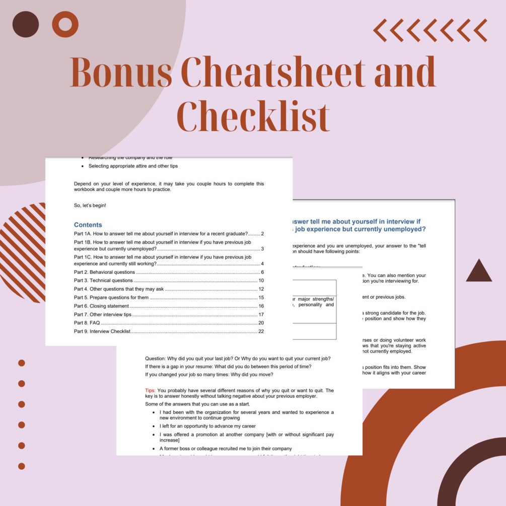 With over than 30 tips, step-by-step process, cheatsheet and checklist, you'll be fully prepared and confident for your upcoming interview.